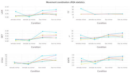 cRQA statistics describing properties of participants’ movement coordination across experimental conditions. For each dyad a single line is drawn.