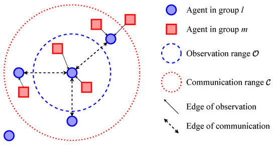 In the multi-agent system, the environment involves multiple kinds of entities, including agents, PoIs, etc. As they are heterogeneous, agents need to treat their local states and model their relationships separately. Thus, we categorize all entities into different groups at the first step of execution in cooperative or competitive scenarios. As shown in Figure 2, M entities (containing N agents) are clustered into K groups and represent the environment’s state as graphs. The agents construct an observation graph and a communication graph respectively based on their observation ranges and communication ranges . The edges of represent that the entities can be observed by agents, while the edges of represent that two of the agents can communicate with each other. The adjacency matrix of and are and , respectively. i’s observation is defined as . Its received messages from the others is , where is agent j’s local state and is the message that j sends to i.