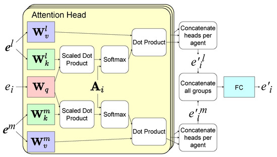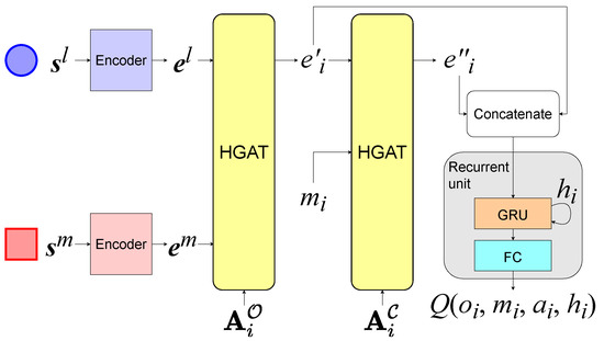 At each timeslot, the agents use the network shown in Figure 3 to determine their actions according to , , and received from the environment, where . The parameters of the network are shared among the agents in the same group. The network contains three components, a set of encoders, two stacked HGAT layers, and a recurrent unit, which consists of a gated recurrent unit (GRU) layer and a fully connected layer. GRU is a variant of the recurrent neural network (RNN). To summarize the information in each agent i’s observation , the first HGAT layer processes into a high-dimensional aggregated embedding vector as shown in Figure 4. Firstly, the encoder which consists of a fully connected layer transforms the local states from each group l into embedding vectors as , where means the encoder for group l. is the embedding vector for entity j in group l. Then, it aggregates as [32], where is a matrix that transforms into a “value”. The attention weight represents the importance of the embedding vector from j to i, which is calculated by softmax as [32] if in is 1, otherwise . and transform a embedding vector into a “key” and a “query”, respectively. is used for selection so that only the local states from are summarized. To improve the performance, we use the multiple attention heads here. Finally, from all groups are aggregated into by a fully connected layer , as: