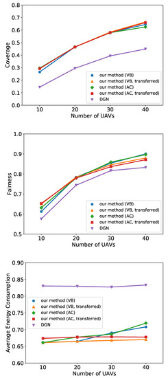 To test the capability of transferred learning, we compare the transferred policies with those trained under the same settings of testing. As shown in Figure 6, the performance does not deteriorate when the policy is transferred to execute with 10, 30, or 40 UAVs, which indicates that our method is highly transferable under various numbers of UAVs.