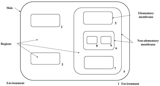 The cell-like P system is the first generation of the membrane computing model. The structure is shown in Figure 1. It is divided into basic membranes (such as 2, 3, 5, 7, 8 and 9) and non-basic membranes (such as 1, 4 and 6). Membrane 1 is also called the skin membrane, isolating the P system from the external environment.