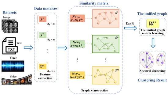 The working principle of GBS is to employ the nearest neighbor method to effectively construct the similarity matrix after extracting the data feature matrix of each view. Then, an iterative optimization algorithm is adopted to automatically weight each similarity matrix to learn a unified affinity matrix. It can directly gain the final cluster labels in the unified graph. Peng et al. [] set the neighbor size to 10 and used the cosine distance as a metric to construct a similarity matrix, and then updated it iteratively with an objective function that includes geometric consistency. GMC [] automatically weights and merges the similarity matrix of each view to generate a unified graph matrix. The two improve each other by means of iterative optimization algorithms and give the final cluster directly without additional algorithms. Tan et al. [] proposed a two-step multiview clustering method that exploits sparse representation and adaptive graph learning to optimize the similarity matrix of a single view, and retains the internal structural characteristics of each view. Further, the global optimal matrix is obtained through adaptive weighted cooperative learning for each view. Huang et al. [] merged the consistency and diversity of multiple views into a unified framework to form a “consistent and divergent multiview graph” (CDMGC). At the same time, an alternating iterative algorithm combines the consistency part with the automatically learned weights, and the consistency part is further integrated into the target affinity matrix. Finally, the clustering label of each instance is directly assigned.