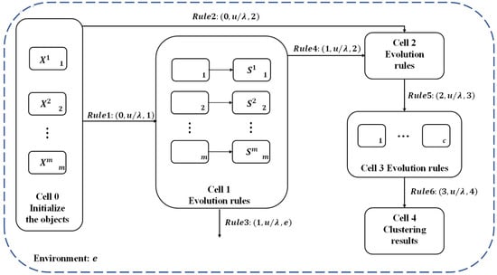 The input cell 0 initializes the data object. It transmits the data and corresponding parameters of the multiview to cell 1 to determine the Natural Characteristic Value and construct the similarity matrix of each view. At the same time, the number of clusters c is transported from cell 0 to cell 2 to form a new cluster sample for k-means. The rule R0 can be described in detail as: