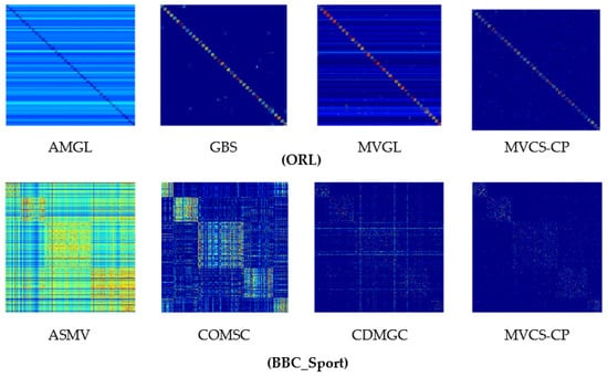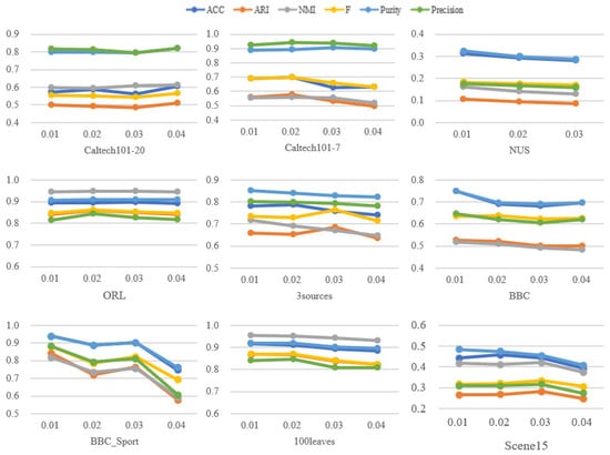 In this paper, the parameter is used when forming the unified graph matrix, and its selection range is . It can be seen from Figure 9 that the clustering effect of MVCS-CP is relatively stable in the parameter range from 0.01 to 0.04. When the parameter of the NUS dataset is 0.04, the data is too complex to be read during clustering, so only the results from 0.01 to 0.03 are shown in the figure. Figure 9 demonstrates that the proposed method is less sensitive to parameters.