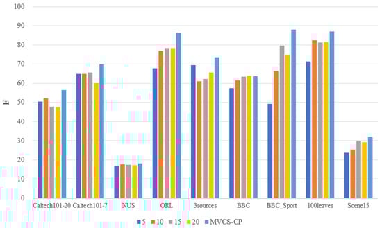 Determining the number of neighbors in each view is an important step for the MVCS-CP method before constructing the similarity matrix, which is different from other methods. Table 12 indicates the different number of neighbors automatically determined for each view for the nine datasets. It can be seen that except the 3sources dataset has the same number of neighbors in each view, the rest of the datasets are different. In order to verify that automatically determining the number of neighbors can effectively improve the clustering results, the fixed number of MVCS-CP methods will be adopted for comparison. Figure 7 and Figure 8 show the comparison of the ACC and F metrics when the number of neighbors is fixed at 5, 10, 15, 20 and the number of neighbors is automatically determined, respectively. The MVCS-CP method has the best clustering effect on both ACC and F values, which show the effectiveness of automatically determining the number of neighbors.