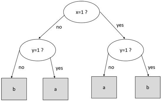 A decision tree is a supervised data mining technique that creates a tree-like structure, where the non-leaf node tests a given attribute [45]. The outcome gives us the path to reach a leaf node, where the classification label is found. For example, let (x = 3, y = 1) be a tuple to be classified by the decision tree of Figure 1. If we test , we must follow the left path to reach and finally arrive at the leaf node with the classification label “a”.