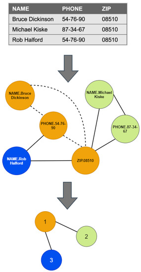 The network represents the relationships between attribute-value (nodes) of each record and the relationships between different database records. For example, the dotted lines in Figure 2 show the relationships between the first record’s attribute value. Links of the node ZIP.08510 are the relationships between the three records, and the links of PHONE.54-76-90 are the relationships between the first and third one. The box-covering algorithm groups these relationships into boxes (network records). The network in the middle of Figure 2 shows that the three boxes (in orange, green, and blue) coincide with the number of records in the database. However, the attribute value of each box does not coincide entirely with records in the database since box-covering finds the minimum number of boxes with the maximum number of attributes where the boxes are mutually exclusive.