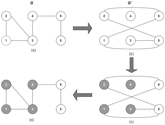 The process to compute the minimum number of boxes of diameter l to cover the network G is shown in Figure 3. A dual network () is created only with the nodes of the original network, Figure 3b. Then, the links in are added following the rule: two nodes i, j, in the dual network, are connected if the distance between is greater than or equal to l. In our example, , and node one is selected to start. Node one will be connected in with nodes five and six since their distance is four and three. The procedure is repeated with the remaining nodes to obtain the dual network shown in Figure 3b. Next, the nodes will be colored as follows: two directly connected nodes in must not have the same color. Finally, the nodes colored in are mapped to G; see Figure 3c. The minimum number of boxes to cover the network given l equals the number of colors in G. In addition, the nodes in the same color belong to the same box. In practice, ; thus, of the example are shown in Table 1. For details of the box-covering algorithm, the reader is referred to [54].