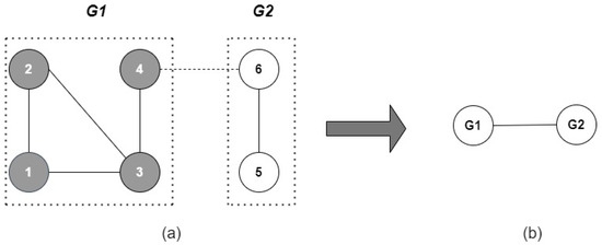 Now, we are ready to compute . Two boxes were found following the previous example for for ; see Figure 4a. The is the average link per node between the nodes of this box; for this reason, the link between nodes four and six is omitted in this computation. Similarly, . The is the degree of each node of the renormalized network; see the network of Figure 4b.