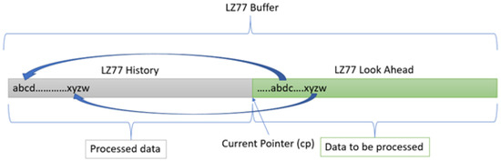 Our innovative Keops algorithm derives from the ubiquitous LZ77 [47] data- compression algorithm and uses it as a preferred compression method internally. LZ77 achieves compression by splitting a stream of data to be compressed, also known as an input stream, into two portions; the data are divided by using a current processing pointer called the current or compression pointer cp. The two sections are called LZ77 History and LZ77 Look Ahead, respectively (Figure 1). LZ77 History represents past data that has already been processed and compressed up to the current pointer. Obviously, past the current point (including the cp) are data yet to be processed, which creates the LZ77 Look Ahead section—hence the name.