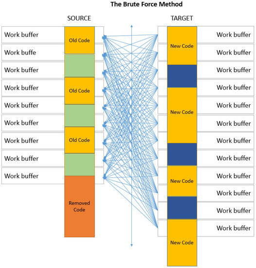 The de-synchronization of the code necessitates a search for the most similar buffer in the target. In Keops, the search is conducted by using the LZ77-based compression distance. The brute-force strategy supposes an exhaustive search over the entire source code. This increases the probability of a good match, although it is not optimal as long as the buffers in the target file are processed sequentially. However, our experiments have shown that with this strategy, we are close to the optimal pairing, and consequently, the best compression for this type of updated software. Figure 6 depicts the buffer pairing by using the brute-force strategy. The drawback of this strategy is the longer overall processing time of Keops, but this is the price of preserving a close-to-optimal compression.