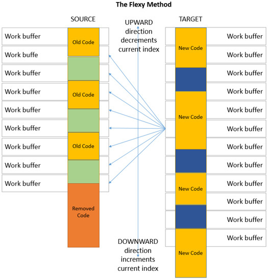 Within updated code or data which may count numerous differences, the most similar buffer of the source is usually in the vicinity of the considered target buffer. This is explained by the fact that the de-synchronization is produced by both removing and adding code blocks; thus, the blocks’ shift is not accumulated. An example is in Figure 7. The flexi strategy addresses this aspect by searching in a limited domain around the position of the considered target buffer. This may be a good compromise between the compression and processing speeds. In Figure 7, with the flexi strategy, the search is done up and down with four positions.