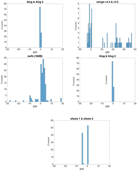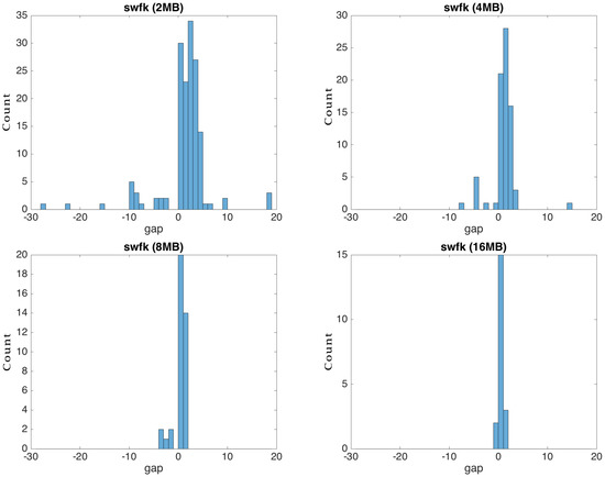 For the flexi strategy, the search of the most similar blocks in the source was conducted up and down with K positions relative to the current block in the target file, where K had a value of four by default. We chose this range after having observed the distribution of the gap of similar blocks in our experimental data (Figure 8). The distribution tended to be concentrated around zero, disregarding the file type. For and , where the newer versions were obtained by using removals, the distribution was bi-modal with a mode gap of two to six blocks, respectively. For and , which have less redundant versions, the distribution was more dispersed. In their case, limiting the search at four gaps degraded the compression, as can be seen from Figure 9. A small block size also spread the distribution (Figure 10), meaning that it is recommended to increase the search area when such blocks are used.