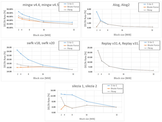 We first analyzed the impact of the block size on the compression. The plots in Figure 9 show that generally, the delta rate improves with the block size. This effect tends to be less important only when working with larger blocks, especially the 16 and 32 MiBs ones. There are many exceptions to this rule of thumb because binary delta creation is a very data-dependent process. If more differences are spotted between the old and the new data, the fewer the matches between them are found by Keops. In conclusion, if data have an extremely low redundancy stream comprised of old and new buffers (files, respectively), the less important the block size becomes.