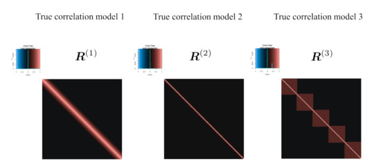 where and indicate the number of rows and columns, respectively. Using this notation, three true correlation models, , , and are set as