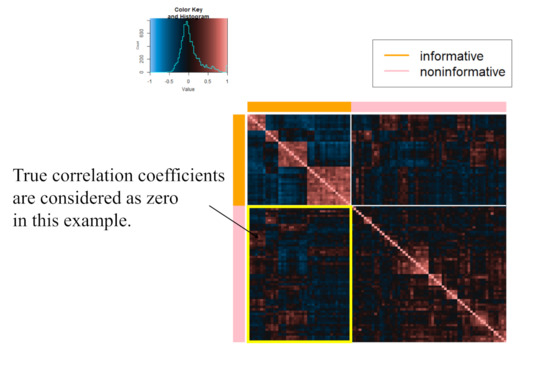 where and are a set of genes belonging to the “informative” and “non-informative” classes, respectively. If Equation (23) is larger, correlation within the same class is considered sparse. For rank, we set 2, 3, and 5. The candidates of for determining the threshold value are set from to in steps of for both approaches, and these algorithms start from 50 different initial parameters. In addition, as was performed for the numerical simulation, the sample correlation matrix, Jiang (2013) with modifications, and graphical lasso are also employed.