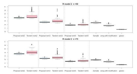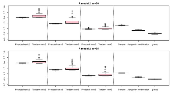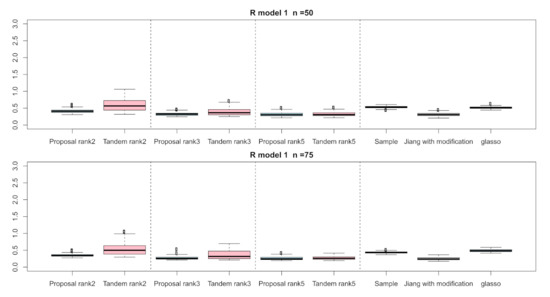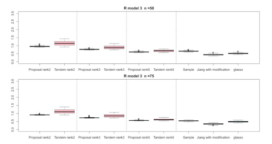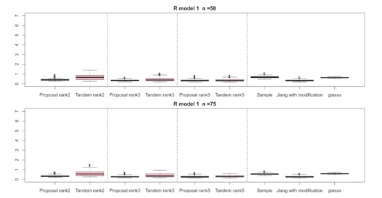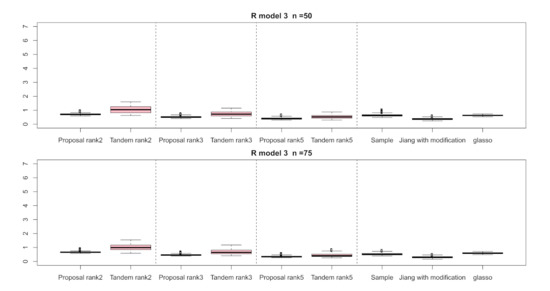 For the relative error of the , Figure 4, Figure 5 and Figure 6 indicate the results of applying these methods to , , and , respectively. Hence, the median of the proposed approach was lower than that of the tandem approach for each pattern. Furthermore, the interquartile range of the proposed approach was smaller than that of the tandem approach in each pattern. Therefore, we confirmed that the results of the proposed approach are effective and stable compared to those of the tandem approach. As rank is set as larger, the results of both the proposed approaches become lower and close to those of Jiang (2013) with modifications in all situations. Among these methods, the result of Jiang (2013) with modifications is the best for the relative error of in the case of and , although that of the graphical lasso (glasso) is the best in the case of . However, it is a natural thing from the properties of low-rank approximation. As was done for the , those of for , , and are shown in Figure 7, Figure 8 and Figure 9, respectively. The tendency of the results for is quite similar to that for . From the results for , we observe that the result of the proposed approach with rank 5 is quite close to that of Jiang (2013) with modifications.