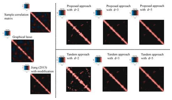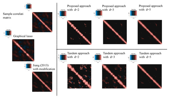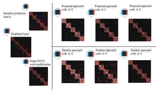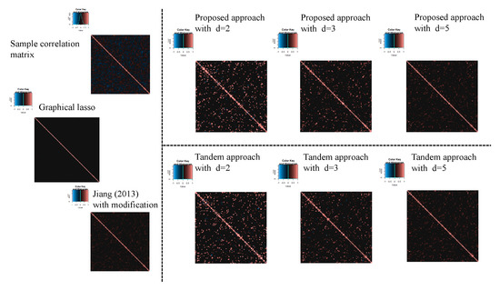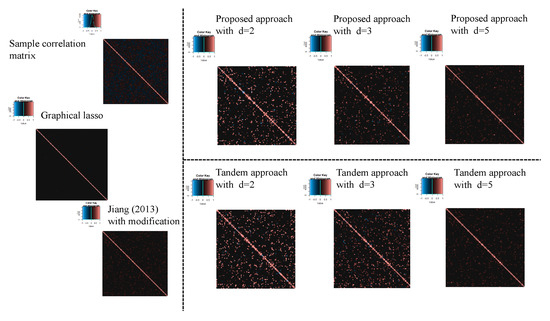 with the constraint . To estimate the sparse correlation matrix without dimensional reduction, there are two methods in this simulation. First, Jiang (2013) with modifications is explained, and this approach is also two steps. The first step is the same procedure as the first step in the tandem approach, and the threshold value is determined. In the second step, by using in the first step, the sparse correlation matrix is calculated as . For the modification, Equation (10) is used as the threshold function (although was used in Ref. [24]). The second approach is graphical lasso [41]. To select the tuning parameters, the CVglasso package is used [42] in R. The correlation matrix is then calculated from the estimated sparse inverse covariance matrix.