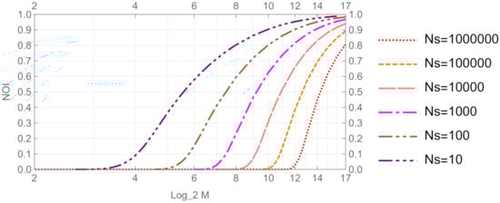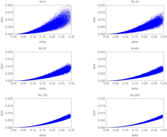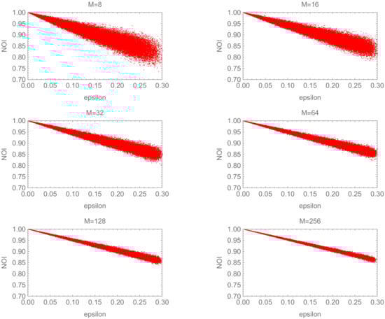 Let . For each m, a normalized vector is randomly generated and the state vector is set to , where is a normalization factor and is a small positive number. When is linearly independent, and are evaluated, where . This procedure was repeated 200 times for each , where was chosen from to with step . Hence, the total number of trials was 60,000 for each M, where .