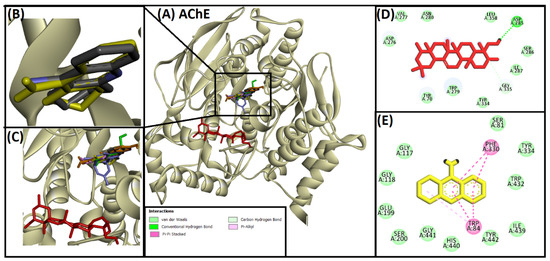 Superimposed image of docked ligands in the active site of AChE (PDB ID: 1ACJ). (A) All of the docked ligands (native ligand: grey color; redocked ligand: yellow color; Alpinetin: pink color; Calycosin: golden color; HuperzineA: blue color; Hydroxytyrosol: green color; Soyasapogenol B: red color) in the catalytic active site. (B) Superimposed zoomed-in image of native ligand and redocked native ligand. (C) Zoomed-in image of all of the docked ligands. (D) Molecular interaction analysis of Soyasapogenol B with amino acid residues. (E) Molecular interaction analysis of redocked native ligand with amino acid residues.