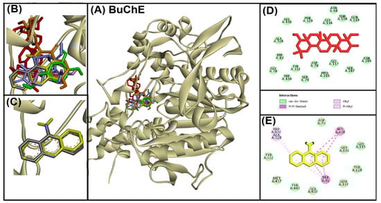 Superimposed image of docked ligands in the active site of BuChE (PDB ID: 4BDS). (A) All of the docked ligands (native ligand: grey color; redocked ligand: yellow color; Alpinetin: pink color; Calycosin: golden color; HuperzineA: blue color; Hydroxytyrosol: green color; Soyasapogenol B: red color) in the catalytic active site. (B) Zoomed-in image of all of the docked ligands. (C) Superimposed zoomed-in image of native ligand and redocked native ligand. (D) Molecular interaction analysis of Soyasapogenol B with amino acid residues. (E) Molecular interaction analysis of redocked native ligand with amino acid residues.