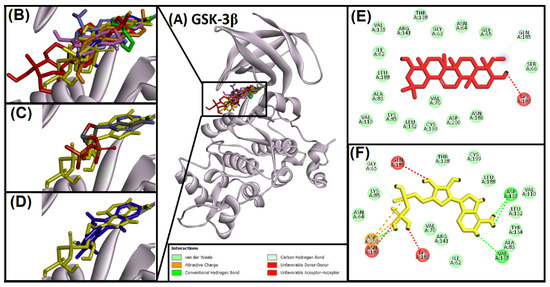 Superimposed image of docked ligands in the active site of GS3Kβ (PDB ID: 1J1C). (A) All of the docked ligands (native ligand: grey color; redocked ligand: yellow color; Alpinetin: pink color; Calycosin: golden color; HuperzineA: blue color; Hydroxytyrosol: green color; Bromoindirubin: dark blue; Soyasapogenol B: red color) in the catalytic active site. (B) Zoomed-in image of all of the docked ligands. (C) Superimposed zoomed-in image of native ligand and redocked native ligand. (D) Superimposed zoomed-in image of inhibitor (Bromoindirubin) and native ligand (ADP). (E) Molecular interaction analysis of Soyasapogenol B with amino acid residues. (F) Molecular interaction analysis of redocked native ligand with amino acid residues.