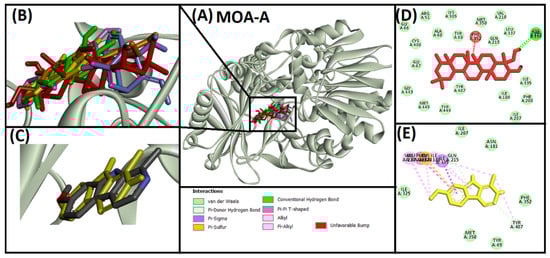 Superimposed image of docked ligands in the active site of MOA-A (PDB ID: 2Z5X). (A) All of the docked ligands (native ligand: grey color; redocked ligand: yellow color; Alpinetin: pink color; Calycosin: golden color; HuperzineA: blue color; Hydroxytyrosol: green color; Soyasapogenol B: red color) in the catalytic active site. (B) Zoomed-in image of all of the docked ligands. (C) Superimposed zoomed-in image of native ligand and redocked native ligand. (D) Molecular interaction analysis of Soyasapogenol B with amino acid residues. (E) Molecular interaction analysis of redocked native ligand with amino acid residues.