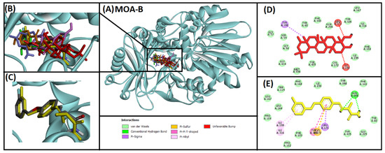 Superimposed image of docked ligands in the active site of MOA-B (PDB ID: 2V5Z). (A) All of the docked ligands (native ligand: grey color; redocked ligand: yellow color; Alpinetin: pink color; Calycosin: golden color; HuperzineA: blue color; Hydroxytyrosol: green color; Soyasapogenol B: red color) in the catalytic active site. (B) Zoomed-in image of all of the docked ligands. (C) Superimposed zoomed-in image of native ligand and redocked native ligand. (D) Molecular interaction analysis of Soyasapogenol B with amino acid residues. (E) Molecular interaction analysis of redocked native ligand with amino acid residues.