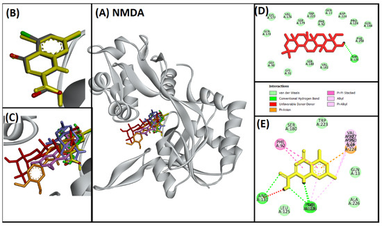 Superimposed image of docked ligands in the active site of NMDA (PDB ID: 1PBQ). (A) All of the docked ligands (native ligand: grey color; redocked ligand: yellow color; Alpinetin: pink color; Calycosin: golden color; HuperzineA: blue color; Hydroxytyrosol: green color; Soyasapogenol B: red color) in the catalytic active site. (B) Superimposed zoomed-in image of native ligand and redocked native ligand. (C) Zoomed-in image of all of the docked ligands. (D) Molecular interaction analysis of Soyasapogenol B with amino acid residues. (E) Molecular interaction analysis of redocked native ligand with amino acid residues.
