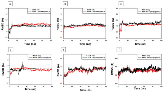 RMSD analysis of Soyasapogenol B with the target proteins. (a) AChE, (b) BuChE, (c) MAO-A, (d) MAO-B, (e) GS3Kβ, (f) NMDA.