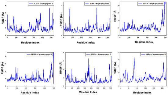 None of the RMSD fluctuations exceeded the allowed limit of 2.0 Å. These results showed that the Soy-B combination with AChE, BuChE MAO-A, MAO-B, GS3Kβ, and NMDA established stable complexes.