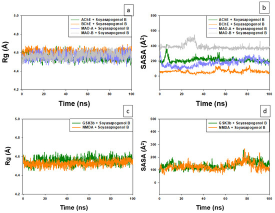 Analysis of radius of gyration (Rg) and solvent accessible surface area (SASA) of Soyasapogenol B. (a) Rg of Soy-B with AChE, BChE, MAO-A and MAO-B; (b) SASA of Soy-B with AChE, BChE, MAO-A and MAO-B; (c) Rg of Soy-B with GS3Kβ and NMDA; (d) SASA of Soy-B with GS3Kβ and NMDA.