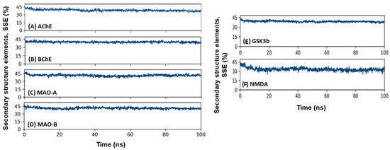 Secondary structure analysis. (A) Soy-B + AChE; (B) Soy-B + BChE; (C) Soy-B + MAO-A; (D) Soy-B + MAO-B; (E) Soy-B + GS3Kβ; (F) Soy-B + NMDA.