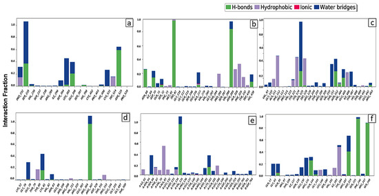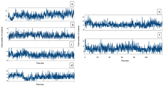 Total number of contacts between Soyasapogenol B and target proteins (a) Soy-B + AChE; (b) Soy-B + BChE; (c) Soy-B + MAO-A; (d) Soy-B + MAO-B; (e) Soy-B + GS3Kβ; (f) Soy-B + NMDA.