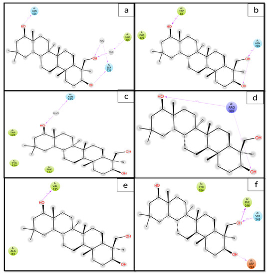 2D representation of the Soyasapogenol B with protein complexes. (a) Soy-B + AChE; (b) Soy-B + BChE; (c) Soy-B + MAO-A; (d) Soy-B + MAO-B; (e) Soy-B + GS3Kβ; (f) Soy-B + NMDA.