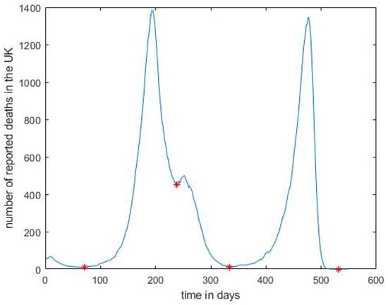 Reported daily COVID-19 deaths from 30 January 2020 to 30 July 2021 and their minima labelled ‘*’, resulting in four distinct waves; a moving average with a centred sliding window of 7 days was applied to the raw data.