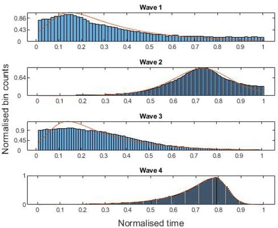 To provide further clarification of the model, we mention that the skew-bi logistic distribution is not a mixture model per se, in which case there is a mixture weight for each distribution in the sum, as in, say, a Gaussian mixture [] (Chapter 9). In the bi-skew logistic distribution case we do not have mixture weights, rather, we have two phases in our context waves, which are sequential in nature, possibly with some overlap, as can be seen in Figure 1 (c.f. [,]). Strictly speaking, the bi-skew logistic distribution can be viewed as a mixture model where the mixture weights are each and a scaling factor of 2 is applied. Thus, as an approximation, we add a preprocessing step where we segment the time series into distinct waves, resulting in a considerable reduction to the complexity of the maximum likelihood estimation. We do, however, remark that the maximum likelihood estimation for the bi-skew logistic distribution is much simpler than that of a corresponding mixture model, due to the absence of mixture weights. In particular, although we could, in principle, make use of the EM (expectation-maximisation) algorithm [] (Chapter 9) and [] to approximate the maximum likelihood estimates of the parameters, this would not be strictly necessary in the bi-skew logistic case, cf. []. The only caveat, which holds independently of whether the EM algorithm is deployed or not, is the additional number of parameters present in the equations being solved. We leave this investigation as future work, and focus on our approximation, which does not require the solution to the maximum likelihood of (14); the details of the preprocessing heuristic we apply are given in the following section.