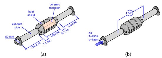 An illustration of the experimental test rig of the catalytic converter is depicted in Figure 1. A stream of dry air ( K, atm) flows through the catalytic converter. The catalytic converter consists of a ceramic monolith at the center, which has a honeycomb structure with 12,468 small square channels, each with a dimension of 0.7 mm × 0.7 mm × 155 mm. Notice that an unwashed catalytic converter was used in the present study. The pressure drop between the inlet and outlet of the catalyst is measured by using a differential pressure sensor (differential pressure transmitters PD-23 of Keller AG) at constant volumetric flow rates of 10.4 m/h to 139.6 m/h. Therefore, the flow rates are controlled by means of a thermal mass flow controller (Bronkhorst EL-FLOW Select F-203AV) for precision tuning of the flow. The bulk of the flow is provided separately and measured by a thermal mass flow meter (Bronkhorst IN-FLOW F-116AI). Notice that a perforated plate is located ten pipe diameters upstream of the monolith. This perforated plate serves as a turbulence-generating grid and ensures that the turbulent flow is fully developed at the entrance of the catalytic converter (see []).