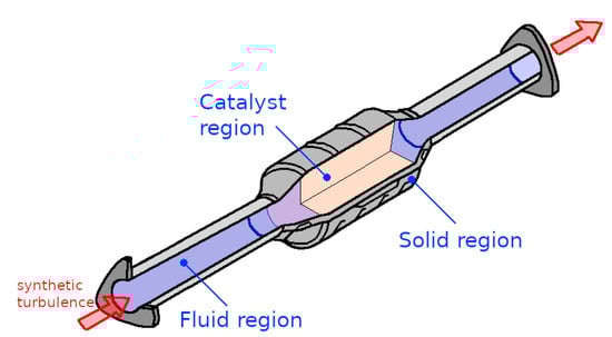 Regarding the boundary conditions, the no-slip velocity boundary condition is applied to the interface between fluid body and solid body, while coupled thermal boundary conditions are used for the temperature (see Equation (4)). Additionally, both the near-wall region and the flow in the catalyst region are fully resolved by the numerical grids. At the inlet, a realistic turbulent inflow condition is generated using the digital filter approach as proposed by []. The unresolved momentum transport is modeled by using the -model [], while the linear diffusivity model with is used to model the unresolved heat transport. The thermodynamic properties of the applied exhaust gas is described in Appendix A. Thereby, in case of hot exhaust gas flow with constant inflow temperature of K, a uniform heat transfer coefficient () and ambient temperature K are specified for the outer wall of the solid region, representing the heat transfer to the ambient. In case of cold air flow, isothermal conditions of K without any wall heat transfer is assumed.