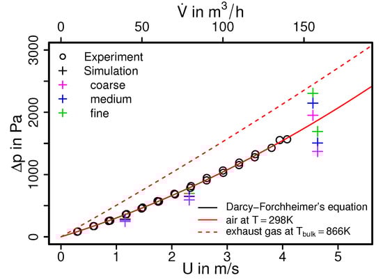 As it can be seen in Figure 4, predicted mean pressure drops obtained from the simulation compared well with the experimental data and also with the derived Darcy–Forchheimer relation. This holds true for both cold air flow and hot exhaust gas flow. Therefore, good agreements are achieved for all flow rates under consideration. However, it can be observed that the predicted pressure drops from the simulation are slightly lower than the measured ones. This is mostly visible in the results from the cases with coarse grid and higher flow rates.