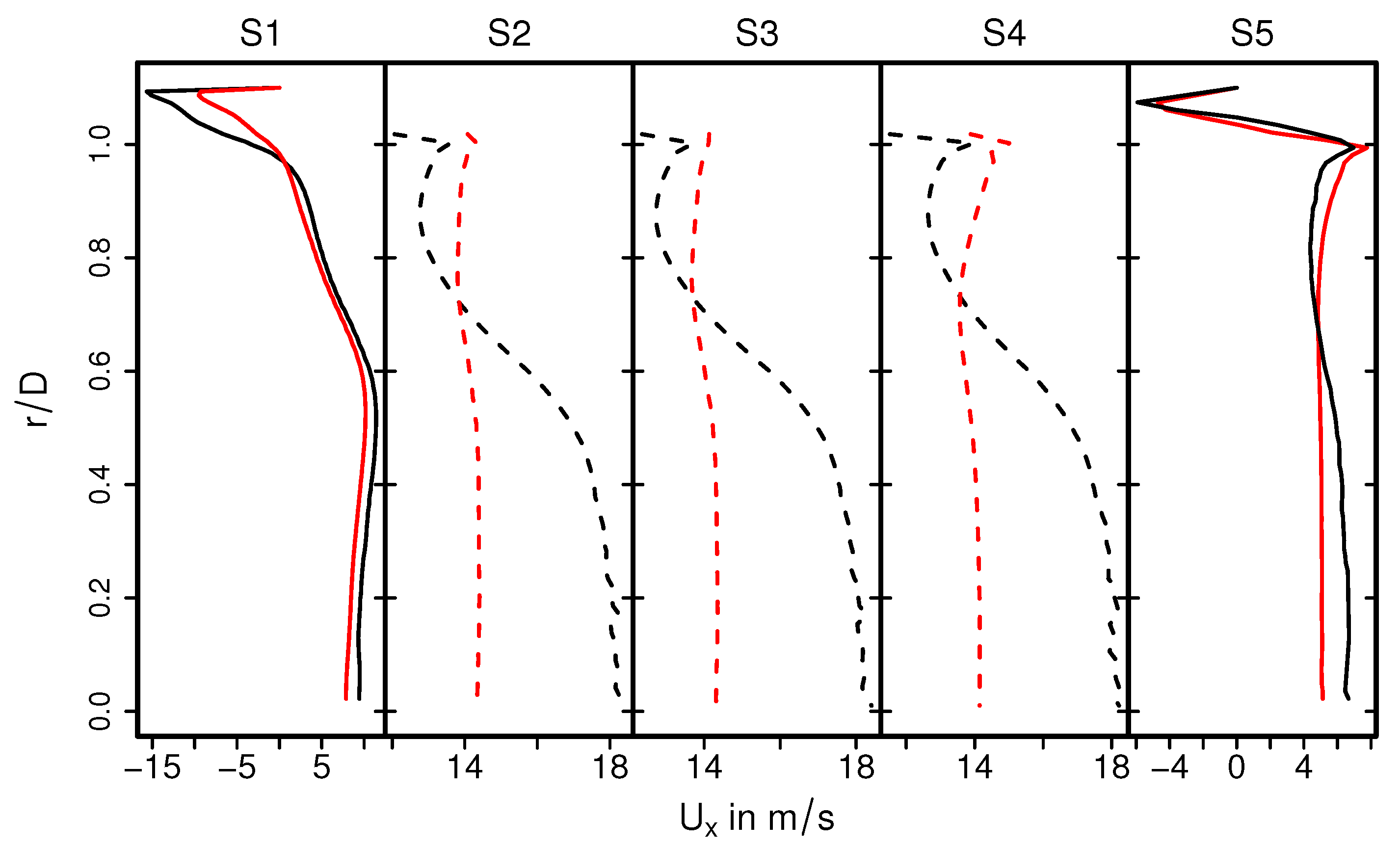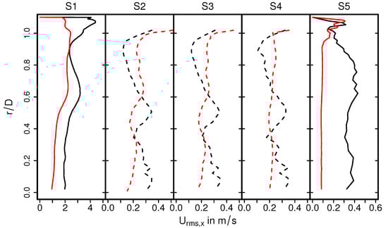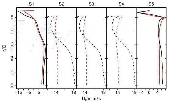 A highly turbulent intake jet can be observed that impinges on the monolith, resulting in recirculation and separation flow in the front of the monolith. Therefore, the pressure around the stagnation point is high and decreases rapidly in the flow direction. Traveling further downstream, the flow gets laminarized inside the monolith and the pressure distribution becomes homogeneous in the radial direction. It is also interesting to observe that even the velocity is small at the stagnation region; the velocity inside the monolith is high around the center line and decreases in radial direction. This resultant velocity profile inside the monolith remains constant further downstream (see the velocity profile in sections S2–S4). This observation is analyzed quantitatively in Figure 6 and Figure 7 for the predicted mean and root mean square (rms) velocities in longitudinal direction, respectively, at the cross-sections S1–S5. Here, D is the diameter of the inlet pipe and r is the radial coordinate that points to the center ( is located at the duct or monolith center line). The quantities of the isothermal case (case 9) are plotted with black lines, while for the nonreacting nonisothermal case (case 12) they are plotted with red lines. Notice that dashed lines in the cross-sections S2–S4 represent the velocity profile inside the monolith region.