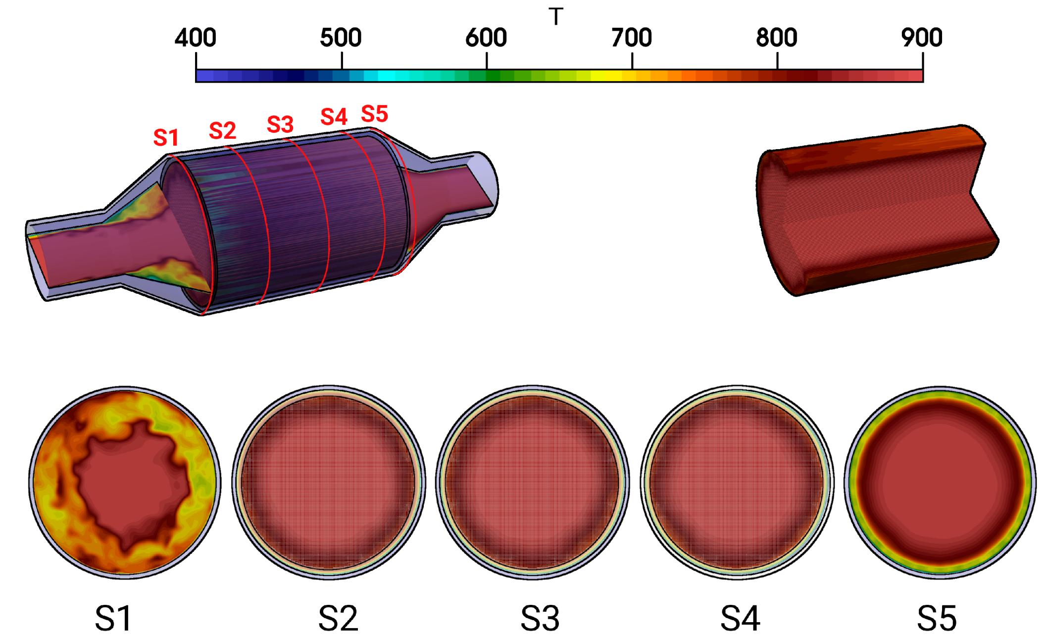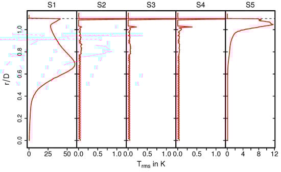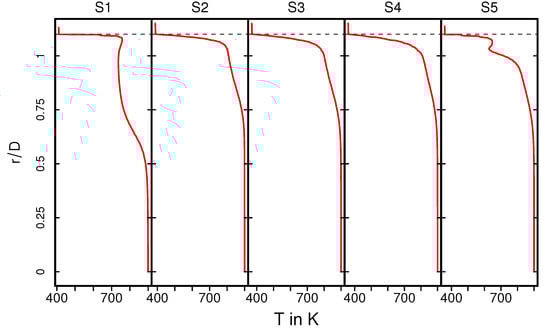 The temperature distribution inside the catalytic converter is shown in Figure 8 (case 12) for the fluid regions, the solid parts, and for several cross-sections (S1–S5) (see Figure 8, bottom). Similar to the velocity field, the hot turbulent intake jet impinges on the front side of the catalyst. Therefore, the evolution of the thermal field inside the monolith appears to be very similar to that of the velocity field (see Figure 5). However, temperature gradients are significantly larger at the solid–fluid interface than at the fluid–ceramic interface. This holds true for all cross-sections in the monolith (see Figure 8, bottom (S2–S4)). The corresponding mean and rms temperature profiles along the radial direction are plotted in Figure 9 and Figure 10 for the cross-sections (S1–S5), respectively.
