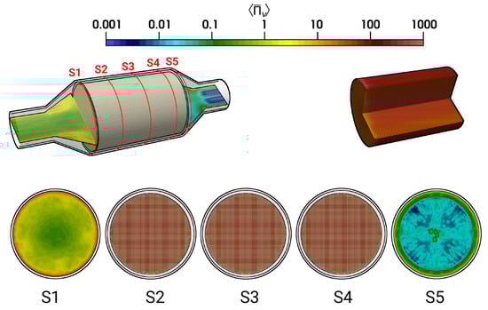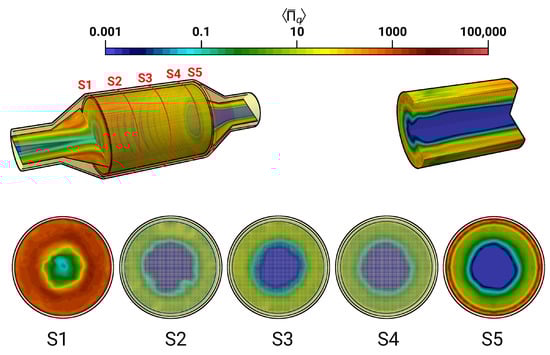 The calculated time-averaged entropy production rate related to viscous dissipation within the catalytic converter is provided in Figure 11 for the isothermal test case (case 9). Therefore, a logarithmic color map is employed to visualize the wide range of entropy production scales.