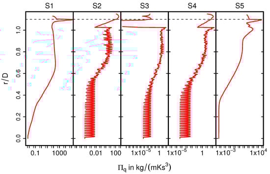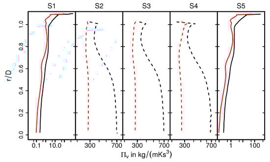 As it is visible in Figure 11 (for case 9), for the section S1, the higher entropy production rates are located predominantly close to the wall where a steep velocity gradient exists, and it decreases rapidly towards the core flow region. However, considerably higher entropy generation rate is observed inside the monolith (S2–S4). This observation can be attributed to the strong turbulent dissipation due to wall-bounded flow along the narrow individual monolith channels, which ultimately results in flow laminarization. Moving further downstream to the monolith (at section S5), the profile features a classical pipe flow characteristic. In order to analyze the impact of heat transfer, Figure 12 presents a comparison of for isothermal (case 9) and nonisothermal (case 12) conditions. Notice that the dashed lines of S2, S3, and S4 represent values of close to the ceramic wall. Outside the monolith (S1, S5), the distributions of are very similar for isothermal and nonisothermal conditions. In contrast, values of differ significantly for isothermal and nonisothermal conditions within the monolith (S2–S4). Therefore, values of are significantly higher under isothermal conditons, which suggests that the irreversible laminarzation process is more intense for such conditions. Notice that the calculated is higher in the core region of monolith under isothermal conditions (case 9, black dash line), implying the combined influence of carrier gas properties and flow profile (see Figure 6) on the entropy generation rate due to viscous dissipation.