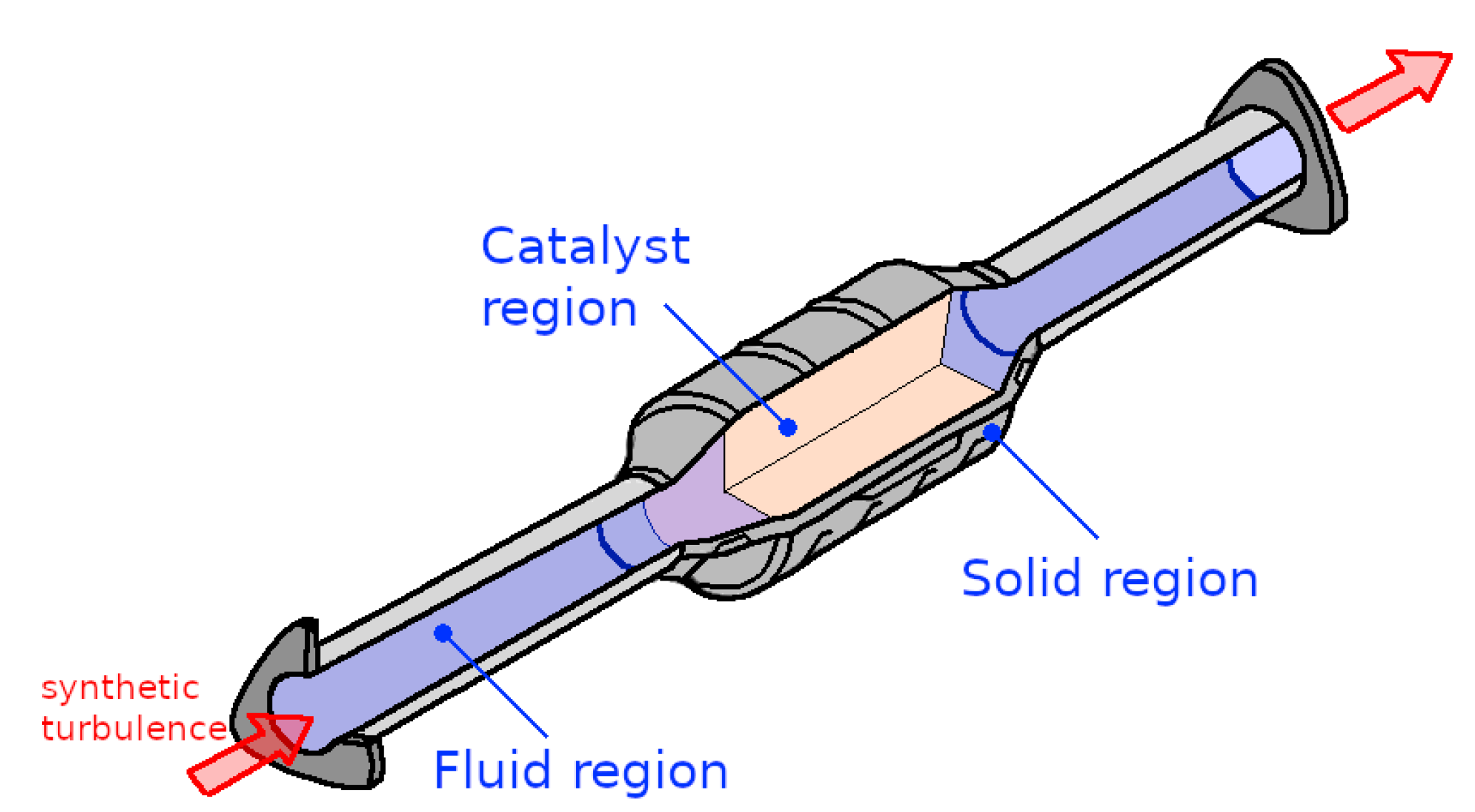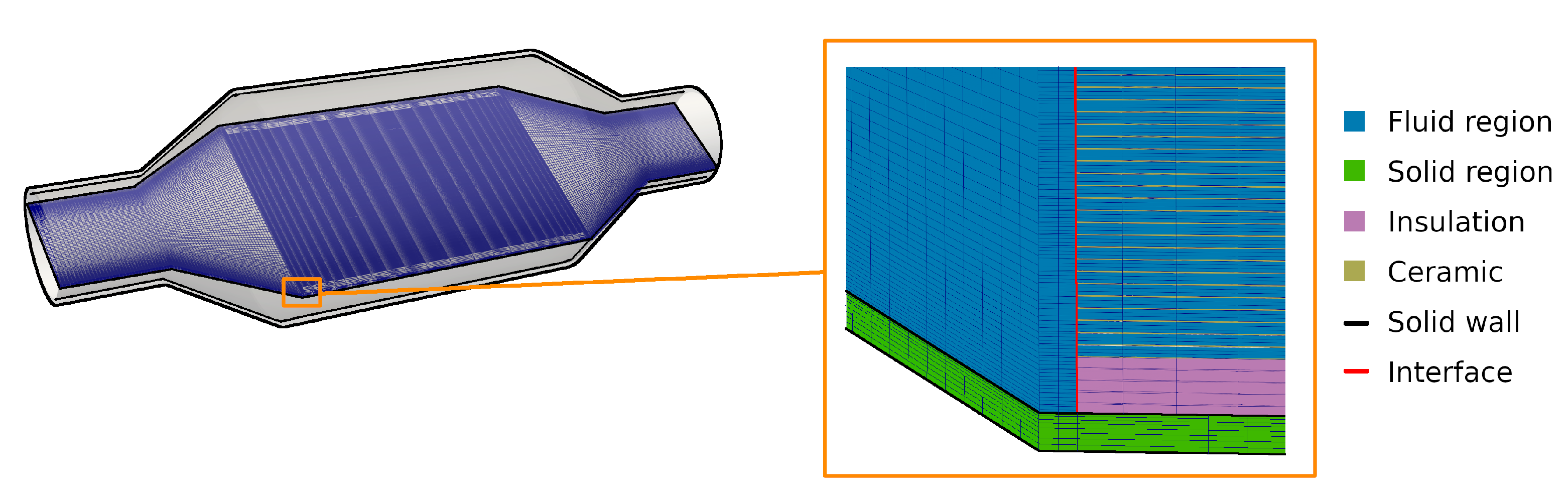 Numerical treatment of the catalytic converter configuration: domain coupling fluid/solid/catalyst regions.