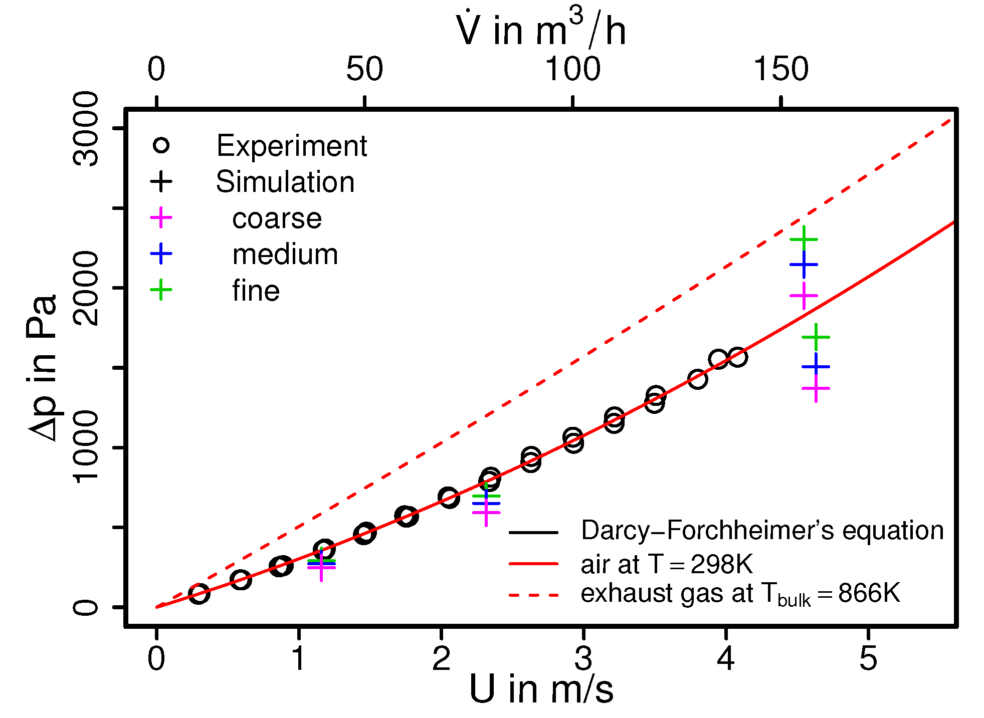 In an automobile engine, the exhaust back pressure is a key design parameter and plays a determining role in efficient engine operation, while the affordable back pressure of an engine largely depends of the pressure drop across various components along the exhaust after-treatment circuits. In this regard, Figure 4 shows the comparison of measured and simulated mean pressure drops as a function of the volumetric flow rates for a three-way catalytic converter employed in Lada Niva 21214. The experimental data is presented in a black circle and simulation data are shown as crosses, while the red solid line denotes a best fit of the measured pressure drop based on the Darcy–Forchheimer law []. The dashed red line shows the corresponding Darcy–Forchheimer law for the hot exhaust gas ( K). Additionally, the pressure drop between the inflow and outflow side of the catalytic converter can be modeled very accurately by means of the Darcy–Forchheimer equation. For the present catalyst the Darcy–Forchheimer equation reads []: