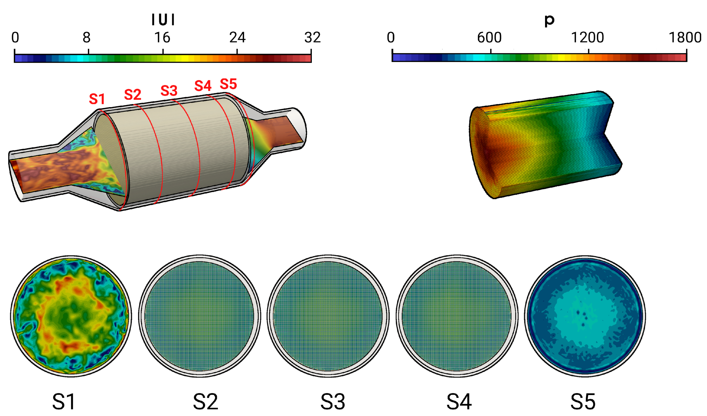Instantaneous velocity field in the catalytic converter and instantaneous pressure field in the monolith along with velocity profile in various cross sectional planes S1–S5.