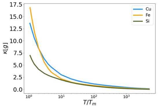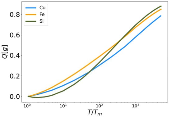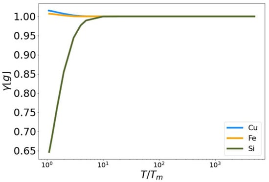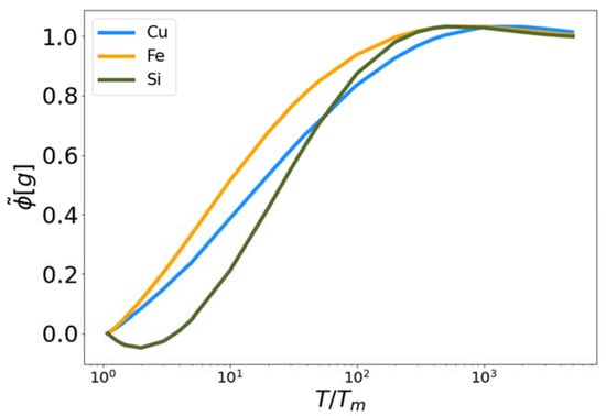 In Figure 6, the functional is plotted for Cu, Fe and Si as a function of reduced temperature. The purpose of this functional is to influence the calculated entropy near the melting temperature, so it should deviate from unity only where there is pre-melting structure in the liquid at temperatures close to the melt temperature. In each case the functional approaches unity at high temperature. However, the functional increases for Si while decreasing to differing extents for Fe and Cu. Again, the parameters and were optimized to fit the excess entropy functional (Equation (5)) to the target entropy obtained via thermodynamic integration.