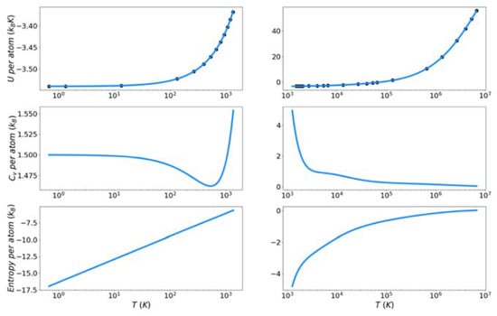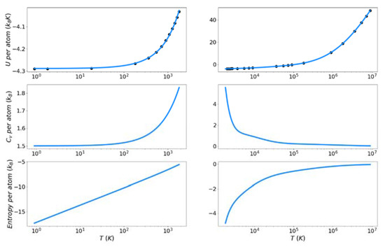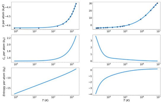 Figure 7, Figure 8 and Figure 9 show the solid and liquid target entropy developed as described in Section 3 for each of the three systems we have investigated. For each composite figure, the left column describes the solid and the right column the liquid. The x axis is reported in absolute temperature from 1 K to the melting temperature (solid) and from the melting temperature to nearly ten million K (liquid). Each column contains three figures, the potential energy (top), the excess constant volume heat capacity (middle) and the excess entropy (bottom).