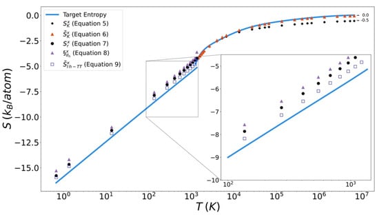 Excess entropy from the functionals has been plotted with the target entropy. These results for copper, iron, and silicon are included in Figure 9, Figure 10 and Figure 11 respectively. Comparable plots for Johnson Fe appear in in Figure 1, Figure 2 and Figure 3 of Nicholson []. Collectively, in each plot, the reference entropy approaches zero in the high temperature limit. The excess entropy monotonically increases with increasing temperature. As a consequence of these two facts, the excess entropy is always negative.